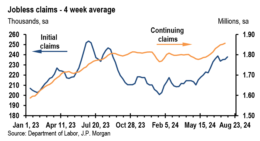 More timely news came with the weekly jobless claims report, which gave a more nuanced picture as both initial and continuing claims moved up, albeit with some residual noise from Hurricane Beryl arguably still affecting the levels. Initial jobless claims for the week ending July 27 jumped to a new high for this year of 249k (from 235k the prior week), and the four-week average approached its recent high from late June. Continuing claims, which shown some stability in recent weeks, broke higher again to 1.877mm. Questions about seasonality have dogged the interpretation of claims lately, and over the past few weeks the NSA initial claims numbers appear to be broadly following the pattern of prior years lower. But the recent rise in continuing claims remains in the NSA data, echoing the more concerning message of labor market weakness in the July employment report.