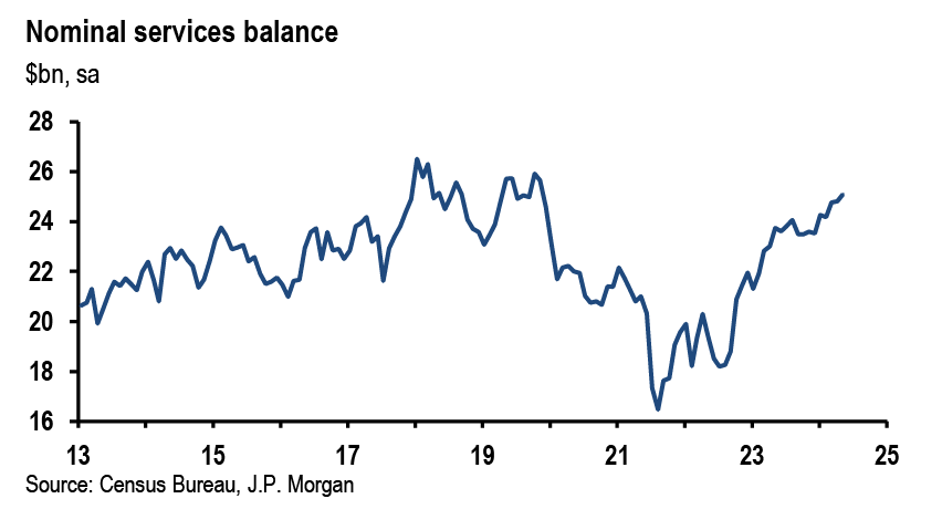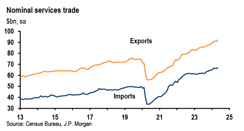 We expect the nominal goods and services trade balance, which was -$75.1bn in May, to narrow to between -$73bn and -$72bn in June. Advance goods trade on a Census basis, which is close to the BOP basis in this report, was already released for June, and it showed the goods deficit shrinking during the month on the back of strong growth in exports. For services, we expect to see ongoing growth in exports and imports that should lead the surplus to continue to slowly increase. The services balance has been rebounding from its post-COVID low as segments like net exports of travel recover.