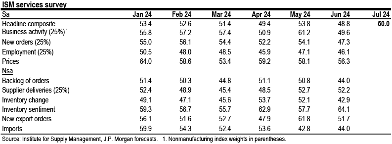 We look for the ISM non-manufacturing index to rise slightly from 48.8 in June to 50.0 in July. The index has been steadily softening for close to a year, but it has also been very volatile in recent months, and the value in June looked surprisingly low, especially with new orders collapsing dramatically to levels usually associated with recession. Consequently we think there is room for it to recover a bit, though our forecast would still be lower than the trailing three-month average of 50.7.