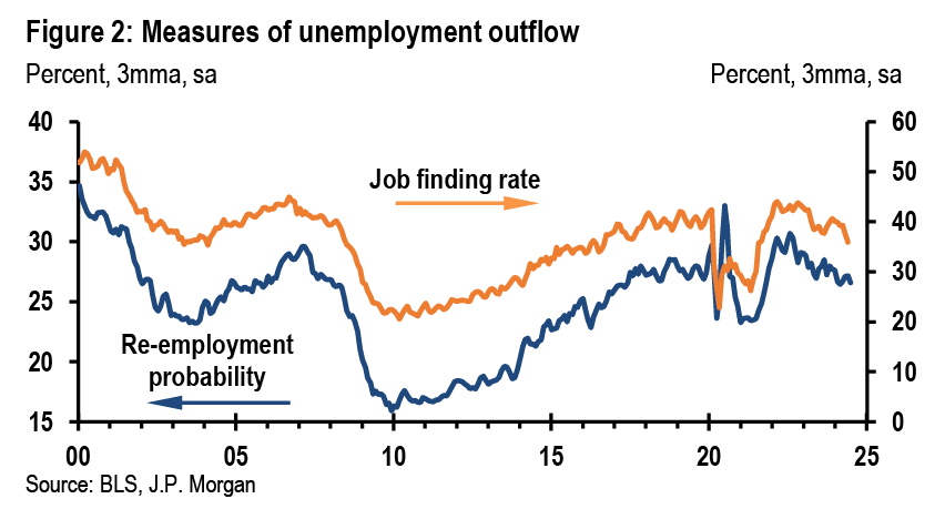 Although the slowing in US employment gains to 114k last month was disappointing, we temper the weight placed on this slide. A surge in employees out of work due to bad weather alongside a workweek decline points to a Hurricane Beryl drag. The allowance for a modest reversal of this drag next month would align job growth with our trajectory of normalizing toward a still solid pace. However, three related labor market developments raise concern. First, as storms depress hours, incomes are normally smoothed as workers continue to be paid, a development not evident in this week’s employment report. Second, the sectoral breadth of job creation narrowed sharply as the diffusion index slipped to 49.6 last month. This signal, consistent with recent business surveys, is not easily linked to bad weather. Third, we have attributed a rising unemployment rate to labor supply gains and a moderation in labor demand that has increased the duration of job searches (Figure 2). While this month’s unemployment rate rise reflects these trends, a notable increase in the flow of workers from employed to unemployed hints at the start of a more troubling behavioral shift toward job shedding.