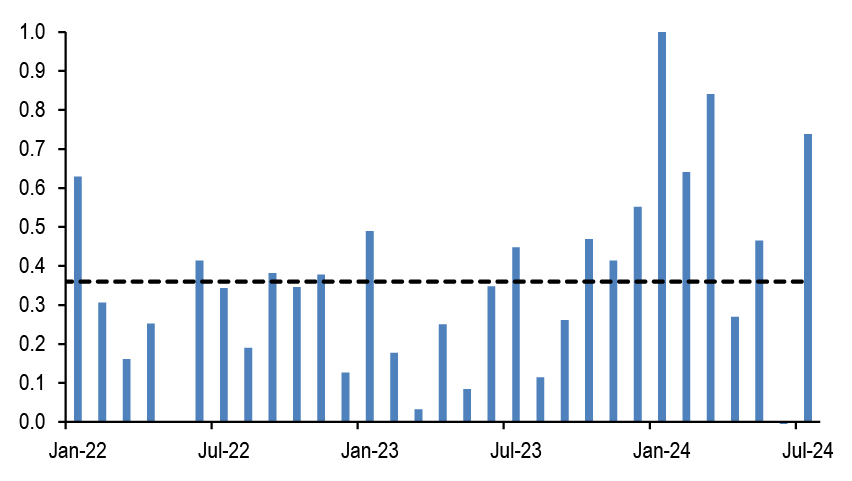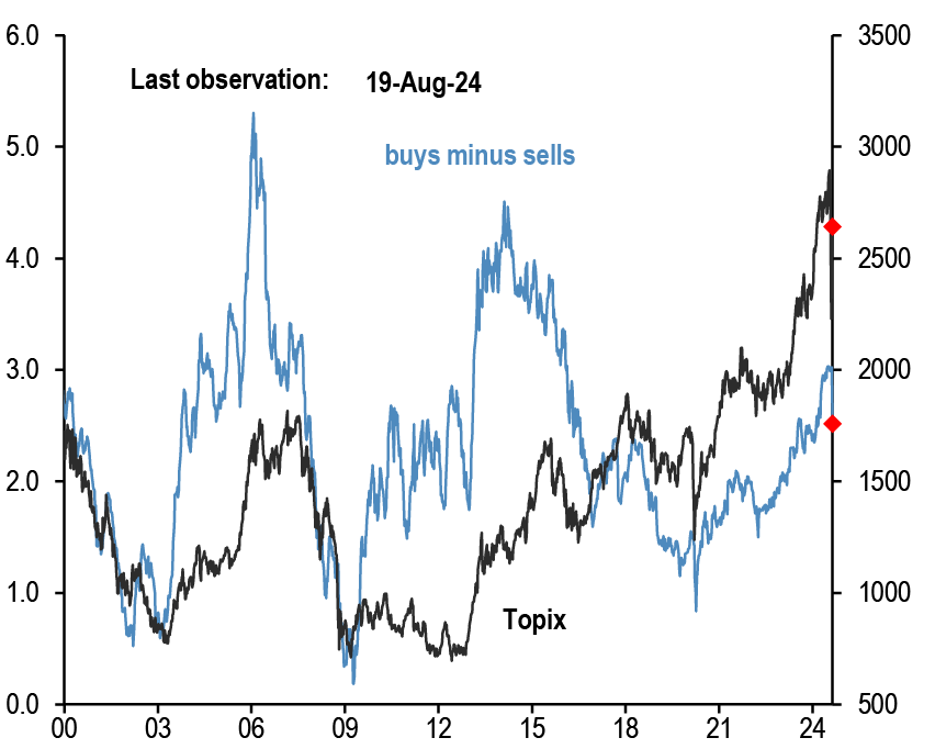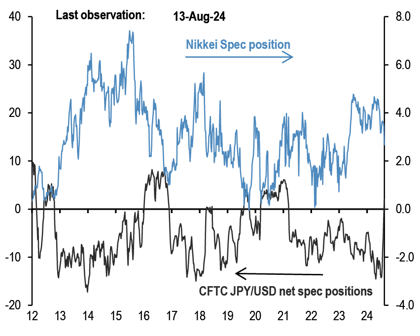 • That said, the speculative position indicator based on the non-commercial category of CFTC data which includes a broader set of macro managers beyond currency only hedge funds, had pointed to a modest long dollar base at the end of July ( Figure 16). Surely some of that previous long dollar base in Figure 16 was due to systematic funds such as CTAs. In particular, the signals from our momentum-based framework (see Tables A3 and A4 in the Appendix) that we regularly use to proxy positioning by momentum traders such as CTAs, pointed to much heavier yen shorts relative to euro shorts at the end of July ( Figure 17). While these previous extreme short yen positions by systematic funds swung from extremely short to extremely long territory and then back down to neutral over the past three weeks, previous euro shorts have seen more orderly unwinding shifting from modestly short territory at the end of July to modestly long territory currently. So in our framework, momentum traders such as CTAs have yet to reach extreme long positions in the euro.