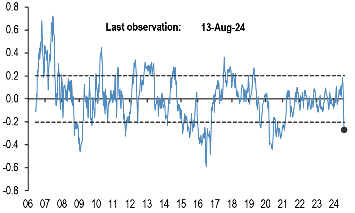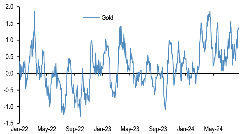 • With Brent oil prices about to breach this year’s low, how oversold are oil positions? As we argued previously the mean of net long positions in Brent futures by the managed money category appears to have experienceda structural shift post the pandemic, as the supply of net short positions by the “producer/user” category has been reduced. After taking this structural break into account, we find that discretionary spec investors have exhibited marked OWs in oil futures in September 2023 and early April 2024 but have shifted in the opposite direction in recent weeks shifting to historically very oversold levels ( Figure 19).