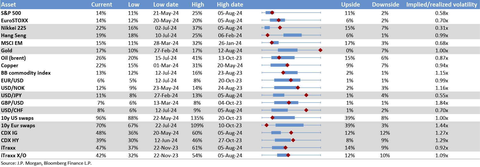 This table shows the richness/cheapness of current three-month implied volatility levels (red dot) against their one-year historical range (thin blue bar) and the ratio to current realised volatility. Assets with implied volatility outside their 25th/75th percentile range (thick blue bar) are highlighted. The implied-to-realised volatility ratio uses 3-month implied volatilities and 1-month (around 21 trading days) realised volatilities for each asset.