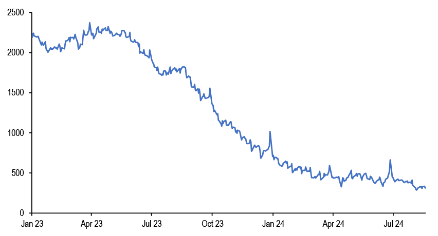 • The question of vulnerabilities in the private equity space was one of the issues that we have touched on in our sister publication Alternative Investments Outlook and Strategy (AIOS). We have noted that rising debt service costs has created issues for older vintages in particular, where deals were made typically with higher leverage and higher interest costs present a larger drain on cash flows and consequently a larger headwind for payouts to private equity investors. In turn, this has been a factor behind the prolonged period of softness in exit activity, amid a persistent gap between the price that sellers expect to receive and what buyers are prepared to pay, even as fundraising has remained robust. One of the manifestations of this gap is the discount to NAV on publicly listed PE funds ( Figure 4). This discount has improved from its lows in 2H22 when it averaged around 25% to 23% in 2023. In 2024, this had improved further from around 20% in 1Q24 and close to 15% in 2Q24. The deterioration in sentiment around risk assets saw it widen again briefly to around 20%., but the recovery in publicly listed markets has also been accompanied by a partial reversal of this deterioration in discount to NAV.