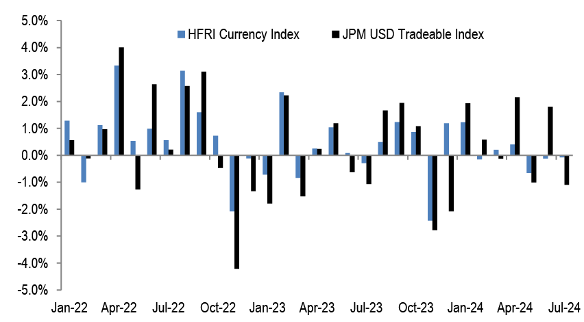 Monthly returns of the HFRI Currency HF index and the JPM USD tradable index.