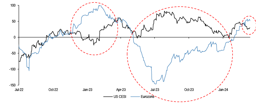 The rebound in Eurozone CESIs at the start of last year helped the equity market outperformance, while the weakness post May has been a drag. We note that Eurozone CESI appears to be moving above the US again.