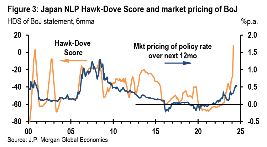 In hiking its policy rate 15bp this week to 0.25% and announcing a plan to halve its gross monthly bond purchases over the next couple of years, the Bank of Japan sent a hawkish message. Governor Ueda stated that more hikes will be delivered if the data flow comes in as expected and stressed that policy settings will remain accommodative even after a few more rate hikes. This clear hawkish break was reflected in our NLP model, which puts the statement on par with some of the most hawkish on record for the BoJ. In suggesting that a series of hikes would be needed to bring the BoJ closer to neutral, we think that Ueda has signaled in concrete terms that the terminal rate will be higher than the 0.5% level priced by markets over the next 12 months (Figure 3). We expect the BoJ policy rates to reach 1%.