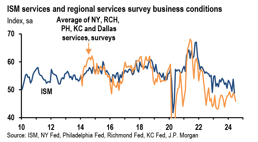 Next week will be very light on data. The most important release will be the ISM services survey, with attention focused on whether a large plunge in new orders in June is at least partially reversed. We will also get the latest Senior Loan Officer Opinion Survey , which will offer a look at how credit conditions among banks were changing during 2Q.