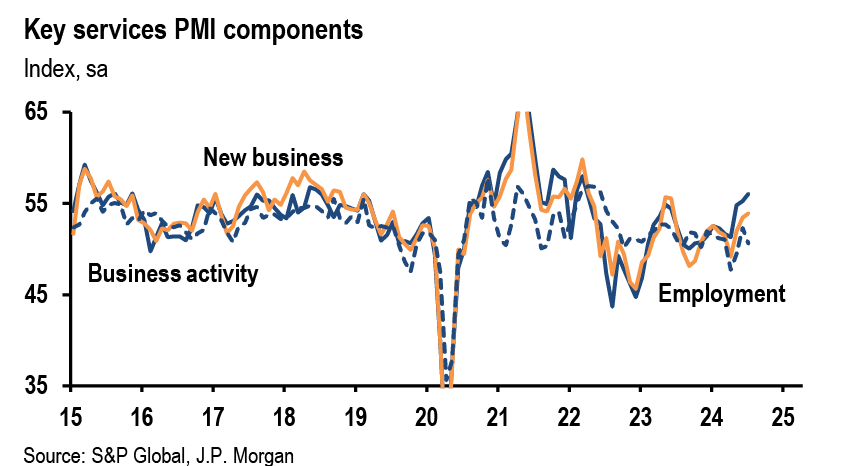 • In the Euro area growth disappointments remain modest while inflation stickiness persists. Regional manufacturing, particularly the German industrial sector, remains depressed, but spillovers to the labor market remained limited. Indeed, this week saw the Euro area unemployment rate rise to a level unchanged from a year ago alongside solid job gains. Meanwhile, core HICP inflation surprised to the upside with a 0.3%m/m July increase. With better news on service price inflation details and the regional-wide composite PMI slipping, the ECB is on course for a 25bp September ease. However, the case for a faster pace of easing will require a shift in the perception of macroeconomic risk.