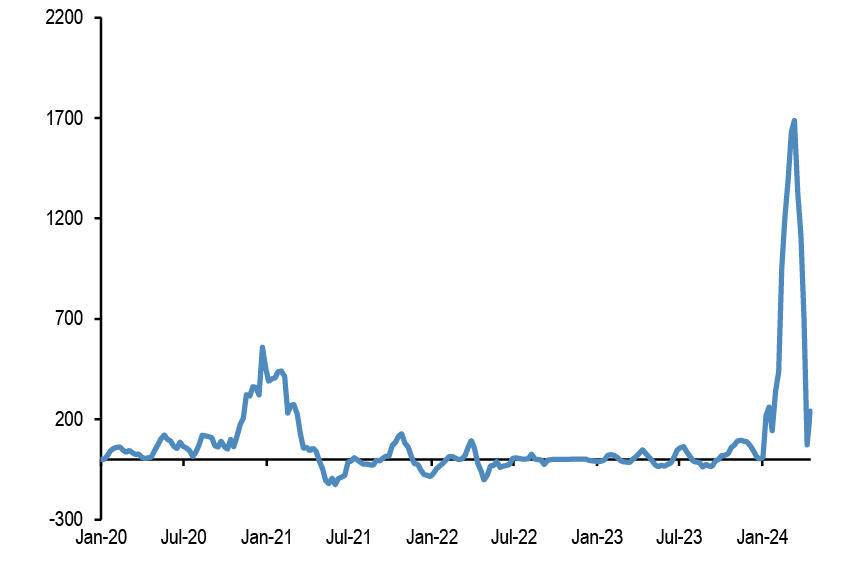 • After the release this week of the Fed’s senior loan officer survey, along with the ECB’s bank lending survey that was released a few weeks ago, financial conditions have again featured in our conversations. After the significant decline in respondents reporting a tightening in lending standards in both the US and the Euro area in the 1Q24 surveys, the latest survey suggested a modest tightening for the US in 2Q and a continued modest decline to close to zero for the euro area.