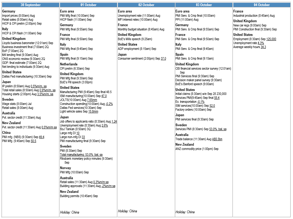Selective list as of 27 September 2024. Forecasts are m/m, nsa, unless stated & times are local. Telephone your J.P. Morgan representative for an update/more details.