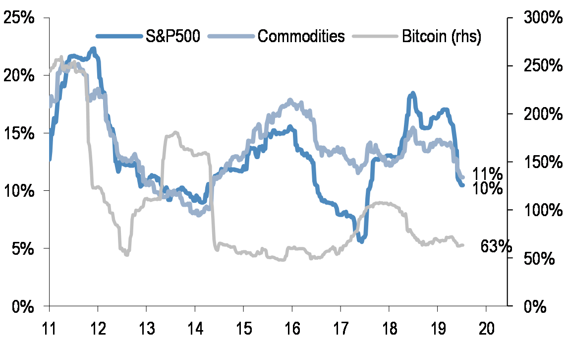 • Bitcoin prices have corrected much of the gap versus intrinsic value but have yet to demonstrate their value for portfolio diversification.
