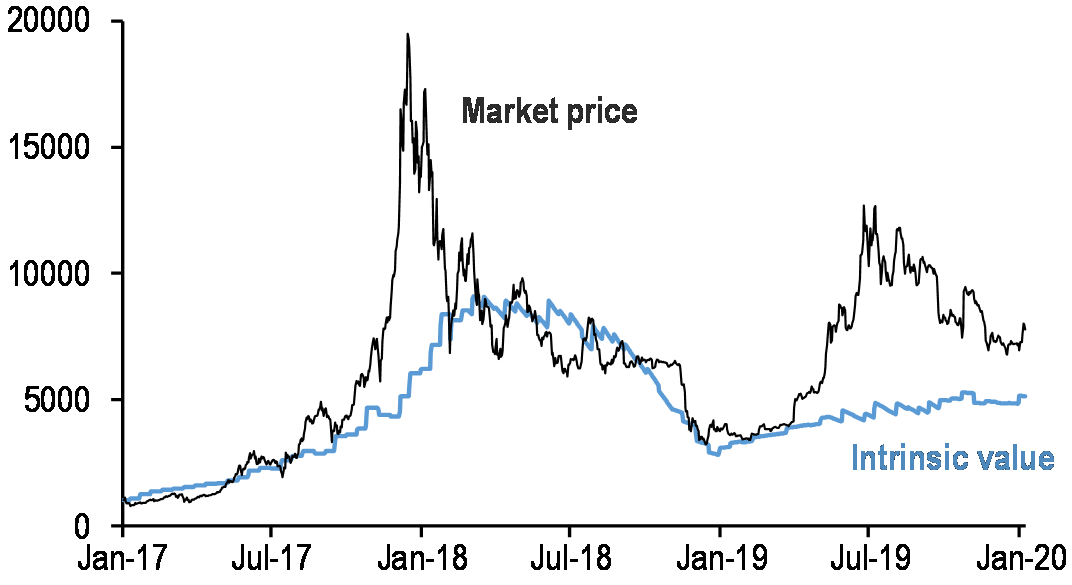 Valuation: Far from institutionalized, but gap closing between market and intrinsic value for cryptocurrencies