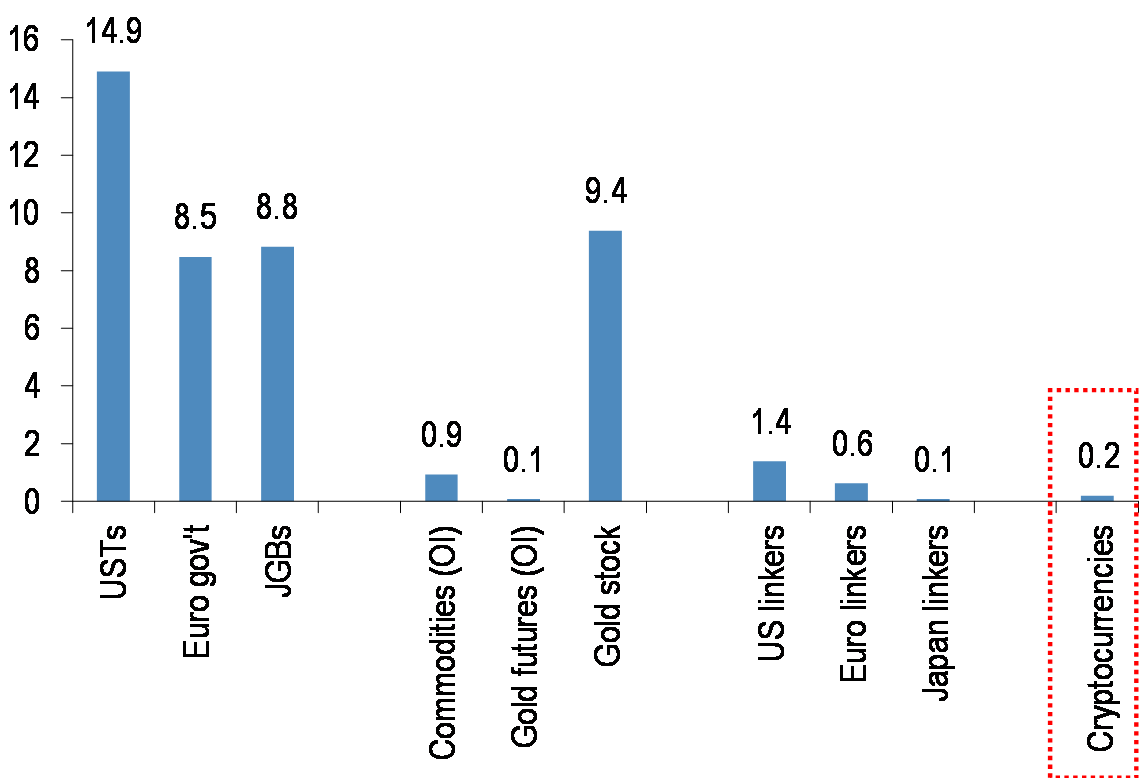 The crypto market continues to mature, and cryptocurrency trading participation by institutional investors is now significant. Bitcoin prices appear slightly overvalued, but much of the gap versus intrinsic value has narrowed. However, Bitcoin and other freely floating cryptocurrencies continue to exhibit extreme volatility relative to fiat currencies, which has led focus towards stablecoins to minimize price fluctuations.5 Normand notes that developments over the past year have not altered our reservations about the limited role that cryptocurrencies play in global portfolio diversification or as a hedge instrument. He argues that crypto assets have a place in investors’ portfolios only as a hedge against a loss of confidence in both the domestic currency and the payments system. Cryptocurrency volatility has fallen, but remains about five times greater than core markets like Equities or hedges such as Commodities.
