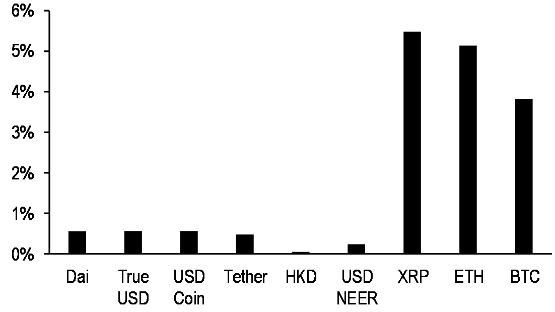 Panigirtzoglou and Inkinen find that the gap that opened up between Bitcoin’s market price and their estimate of its “intrinsic” value has narrowed substantially, largely due to declines in the market price. Its market value continues to trade above their estimate of intrinsic value, suggesting some downside risk remains. However, volatility remains a severe impediment to broader adoption of cryptocurrencies. The IMF notes that the standard deviation of day-on-day changes in Bitcoin prices is roughly 10 times higher than in most G7 currency pairs, and even a little higher than in the Venezuelan Bolivar to US dollar exchange rate.7
