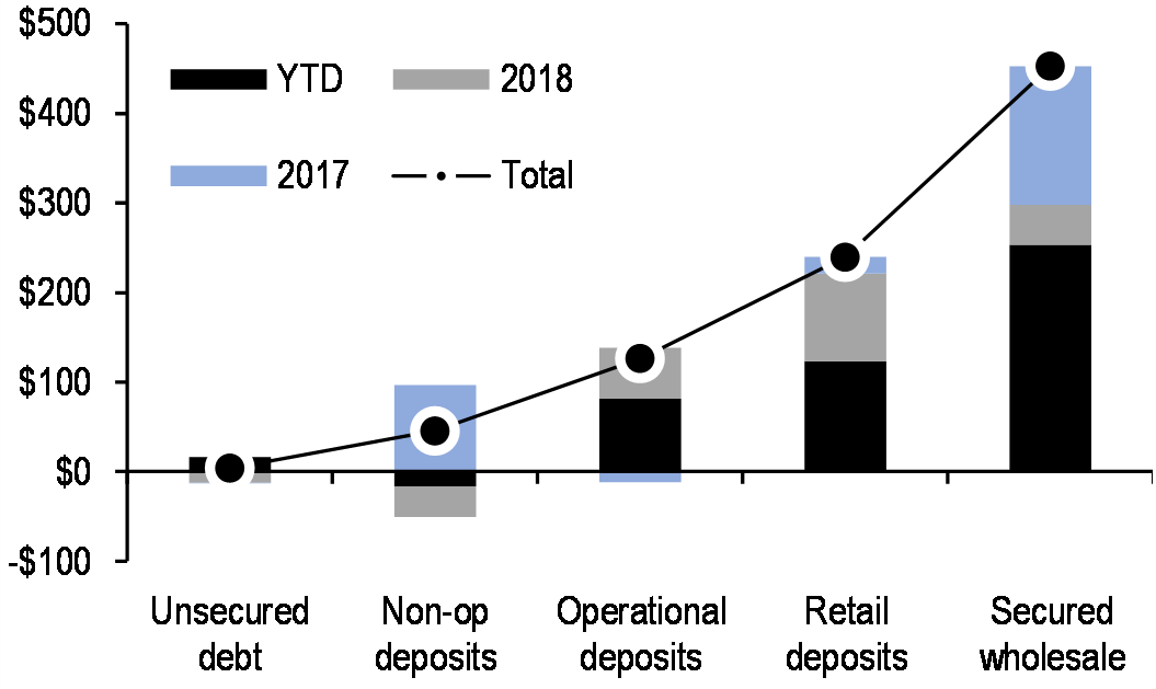 Another small-sized bank that banks cryptocurrency clients is New York-based $3.1 billion asset size Metropolitan Commercial Bank, although at a smaller scale than Silvergate. As of 2Q19, Metropolitan Commercial Bank held $213 million in deposits from digital currency-related customers, or 9% of total deposits at the bank. Not only does Metro gain access to low-cost funding from banking digital currency-related clients, but it also earns fee income from these relationships by providing services such as wire transfers, ACH, and foreign exchange conversion at the same fee as is charged to digital currency-related clients. The niche client base includes cryptocurrency exchanges, hedge funds, and other cryptocurrency investors that seek to move money and use other banking services. We note that deposit balances for digital-currency clients have been on a decline every quarter since 2Q18 and therefore this activity has been a smaller driver of deposit growth.