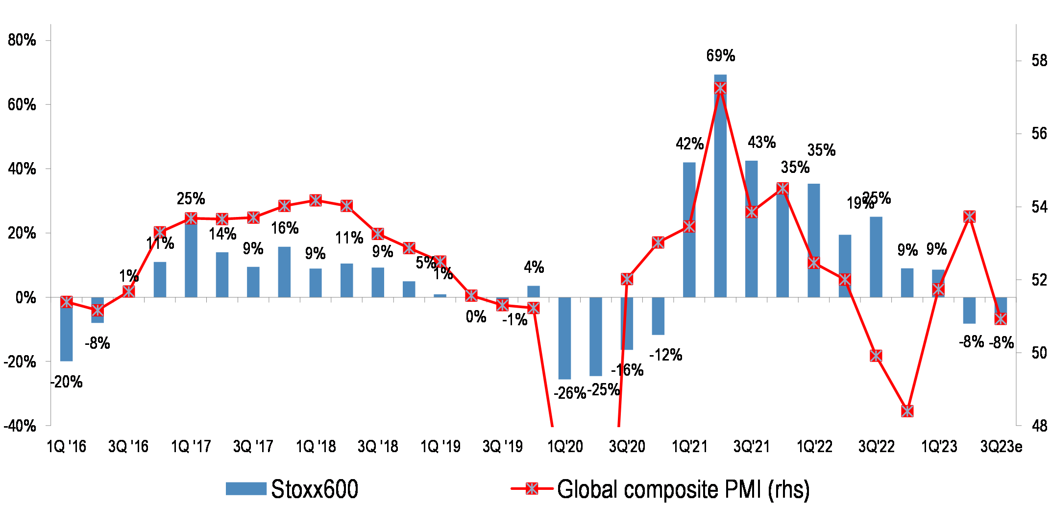 • Looking at the current reporting season, we note an increased share of profit warnings, and topline deterioration – bottom chart. After a long string of robust bottom-up results, it appears that earnings are starting to be more challenging – see our Q3 preview for more details.