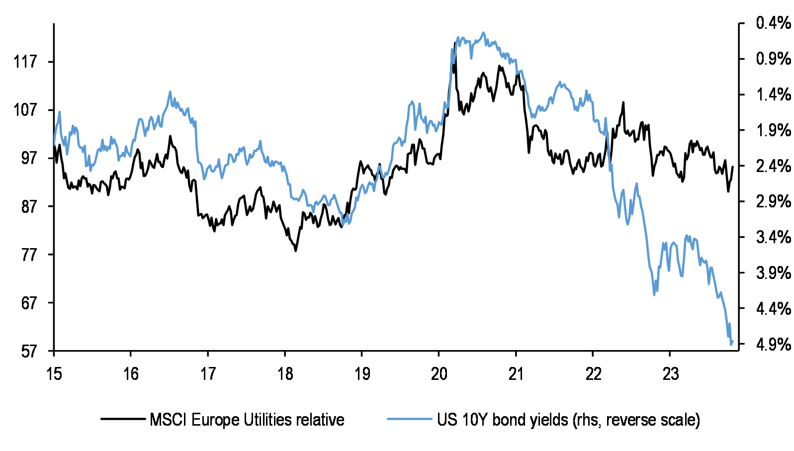 • If the bond yields are in the process of peaking this quarter, as we suspect – see our recent report on locking in the duration trade, then Banks could start to struggle. After all, the Banks rally was underpinned by the sharp move up in bond yields over the past 3 years, with German 10 year moving from -0.5% to 3%, and US 10 year from 1% to 5%. Any potential fall in yields, or the ECB cuts next year, will reduce Banks’ profitability.