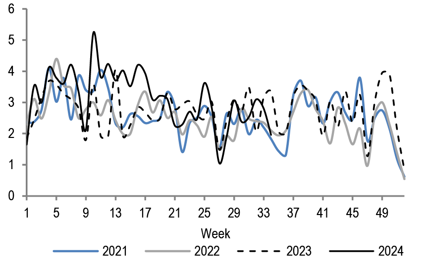 As we look ahead, we continue to forecast 50bp cuts at the September and November meetings followed by 25bp per meeting thereafter. Our forecast is rooted in both the resumption of the disinflationary process which remains broad based across components, together with ongoing loosening in labor markets, which has reduced the risk prices remain sticky. With the beginning of the easing cycle less than a month away and OIS forwards pricing in 103bp of easing through YE24 compared to our own projection of 125bp, this would indicate there is value to being long duration. However we remain patient as growth data has turned more favorable in recent weeks and we do not think the debate surrounding the pace of easing will be settled before the August employment report. Moreover valuations look close to our fair value estimate, and in an environment in which term premium is biased higher, we think it’s unlikely that valuations overshoot to the rich side of fair value. Thus, we remain neutral on duration but continue to favor 5s/30s steepeners as a medium-term expression of our bullish view (see Treasuries).