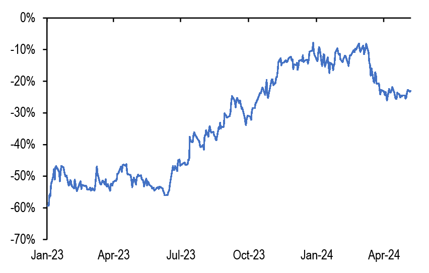 • After the release this week of the Fed’s senior loan officer survey, along with the ECB’s bank lending survey that was released a few weeks ago, financial conditions have again featured in our conversations. After the significant decline in respondents reporting a tightening in lending standards in both the US and the Euro area in the 1Q24 surveys, the latest survey suggested a modest tightening for the US in 2Q and a continued modest decline to close to zero for the euro area.