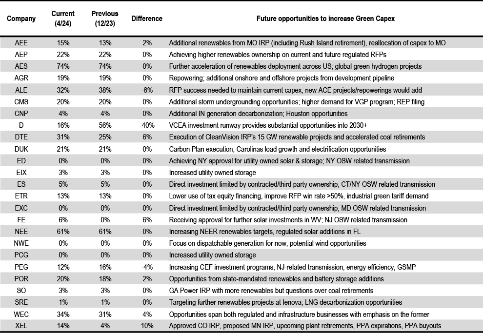 Race to exit coal will continue, regardless of EPA rules or the next President. While the federal court’s composition could possibly somewhat shield utilities with high coal exposure from the Biden Administration’s proposed EPA regulations, we still see significant C&I decarbonization pledges, ESG considerations regarding coal, and advantaged renewable economics motivating utilities to create credible generation transition plans that exit coal. As discussed in our eighth Green Ranker, coal retirements typically translate into higher renewable generation capex, and we find coal exits as a compelling mechanism for IOUs to garner favorable market attention and lower customer bills. Despite many utilities’ plans to exit coal by 2030, we note that higher-than-expected power demand growth, including from data centers, could push back some coal plant retirement timelines. We highlight utilities with high coal exposure beyond 2030 (AEP, D, DUK, and SO) as carrying the highest exposure to current and future EPA regulations. Larger picture, given continued pressure from investors, local and state governments, and market forces, we expect coal retirements to present opportunities, even during a second Trump Presidency.