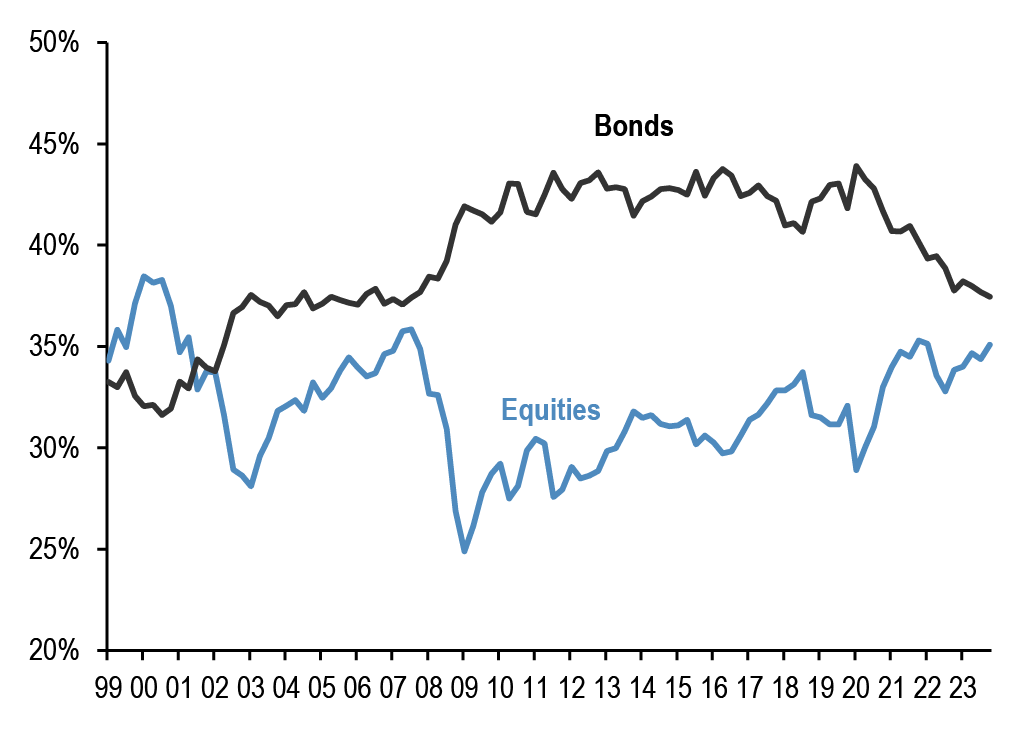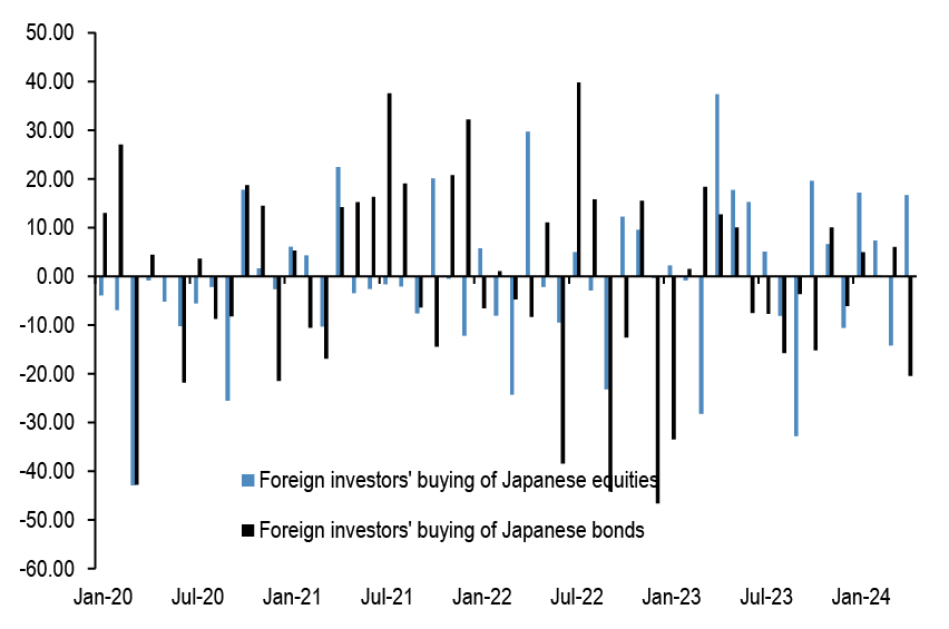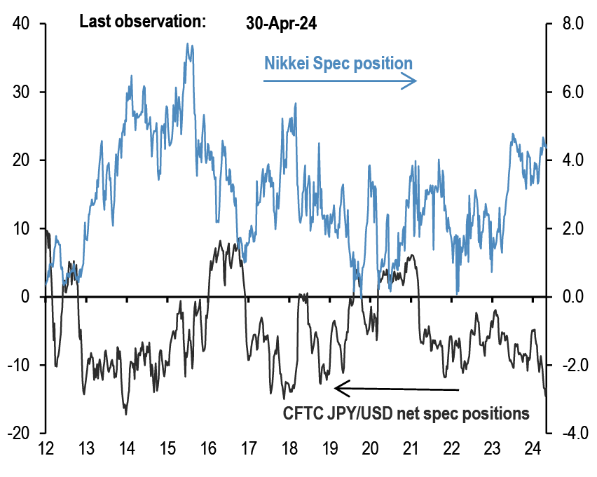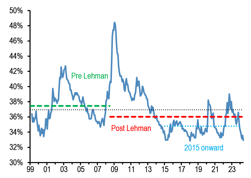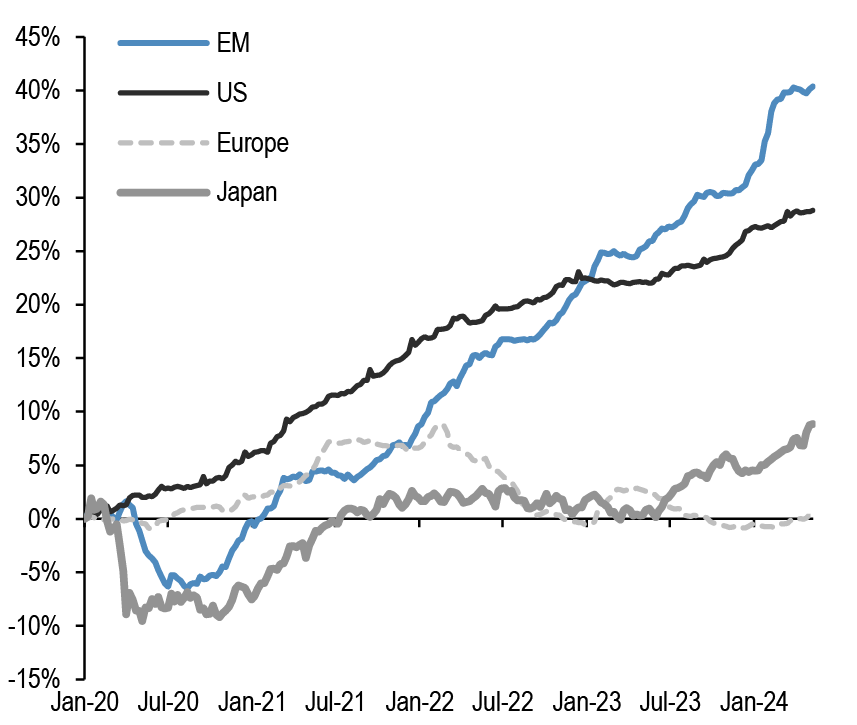• After the release this week of the Fed’s senior loan officer survey, along with the ECB’s bank lending survey that was released a few weeks ago, financial conditions have again featured in our conversations. After the significant decline in respondents reporting a tightening in lending standards in both the US and the Euro area in the 1Q24 surveys, the latest survey suggested a modest tightening for the US in 2Q and a continued modest decline to close to zero for the euro area.