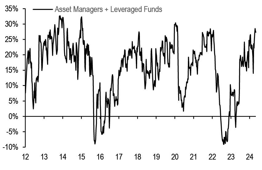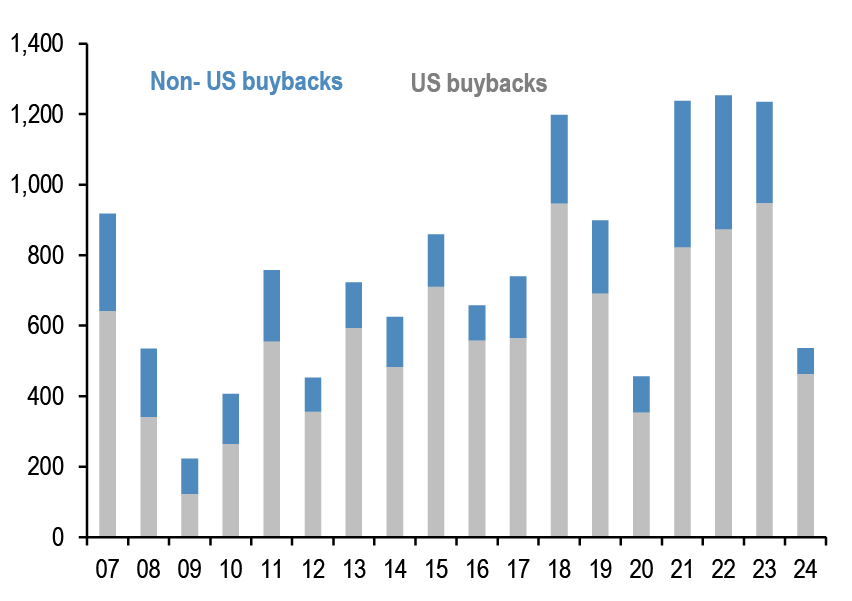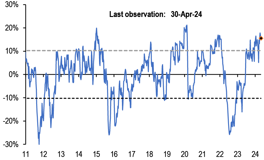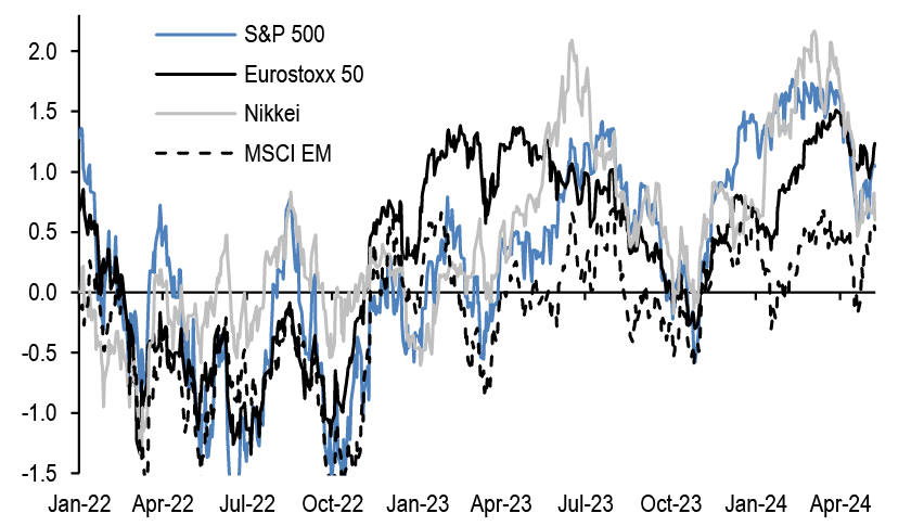 • After the release this week of the Fed’s senior loan officer survey, along with the ECB’s bank lending survey that was released a few weeks ago, financial conditions have again featured in our conversations. After the significant decline in respondents reporting a tightening in lending standards in both the US and the Euro area in the 1Q24 surveys, the latest survey suggested a modest tightening for the US in 2Q and a continued modest decline to close to zero for the euro area.