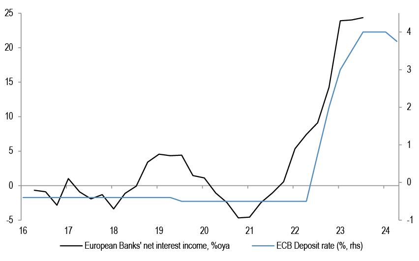 • Bigger picture, CESIs have moved negative recently in a number of key regions, in US, Eurozone, China and Japan. Typically, when CESIs deteriorate, sector leadership is lower beta. Apart from Cyclicals, Financials in particular tended to consistently underperform when CESIs move lower. Banks could also be seeing peaking profits on ECB cuts - bottom chart.