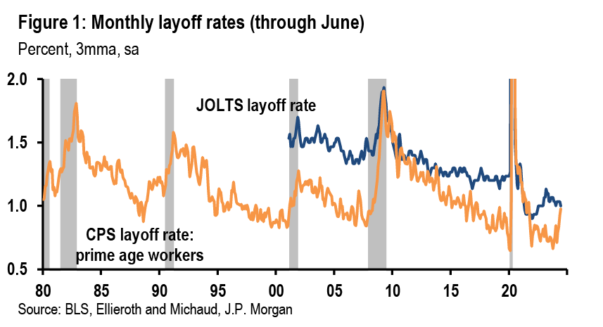 One can also construct a measure of layoffs using the household survey (CPS) by observing workers who made a transition out of employment in a month due to a layoff. In a recent study, Ellieroth and Michaud (2024) construct such a layoff measure (Figure 1). The monthly CPS survey only registers a layoff when a worker (a) exits employment and (b) does not take another job by the time they are interviewed in the next month. Consequently, this CPS layoff rate is sensitive to the chance of finding new work during the month, as opposed to the JOLTS measure which captures all layoffs by surveying employers. Regardless of whether changes in this CPS rate are being driven by rising layoffs or falling hiring, the rate has notably increased in recent months. Its level, which is available through June, is not that much higher than 2019, but the upward move is potentially concerning if it signals more than a normalization following a period at historically low levels. Similar increases in the layoff rate have often, though not always, preceded recessions.