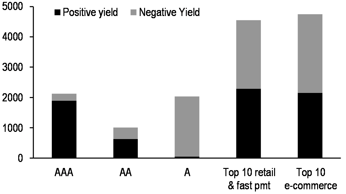 Younger et al. also examine the scalability of Libra and other stablecoins, particularly those backed by assets. They believe that the world is ready for private money, as most of the money in the world already comes from private issuers. However, private stablecoins are likely to face technical hurdles, including the need for intraday liquidity. If the experience of traditional banks is any guide, the institutionalization of stablecoins will come with significant regulatory oversight and costly compliance obligations. Second, they argue that given that DLT protocols are very energy intensive, less distributed, semi-private networks likely will be required. Third, they note that sourcing positive-yielding collateral may be difficult since a significant fraction of short-term high-quality sovereign debt is locked up in central bank balance sheets. The rise in negative-yielding debt poses a significant challenge to Libra and other fiat-backed stablecoins. While global financial markets are awash in high quality short-term government debt suitable as stablecoin collateral, only half offer positive returns. In our most recent J.P. Morgan Perspectives publication, What if US yields go to zero?, 16 January 2020, we outline why the persistence of very low nominal policy rates is here to stay.