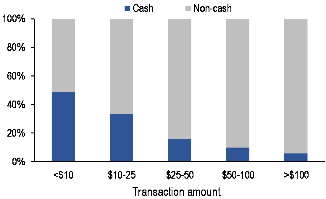 The global payments landscape is evolving, with new systems allowing near-instant person-to-person retail payments increasingly available around the world. Asia represents the bulk of global growth in payments, driven in large part by the explosion in third-party (non-bank) and especially mobile providers. The volume of cashless payments has risen sharply in recent years, especially in Emerging Markets. In China and India, for example, the volume of cashless payments increased more than five-fold over 2014 to 2018, while the volume of cashless payments in Russia has tripled. The IMF notes that the value of e-money transactions in China, such as with WeChat Pay and Alipay, surpass those worldwide of Visa and Mastercard combined.6 Among the various types of noncash payments, card and e-money payments have grown faster. However, we note that despite the rise of cashless payments, cash use is still increasing in most countries. Indeed, only China, Korea, Singapore, Turkey, Indonesia, India, and the US (assuming 2017 numbers)—seven countries in total—have seen an increase in the value of cashless payments per inhabitant over the 2014-2018 time period (Harano).