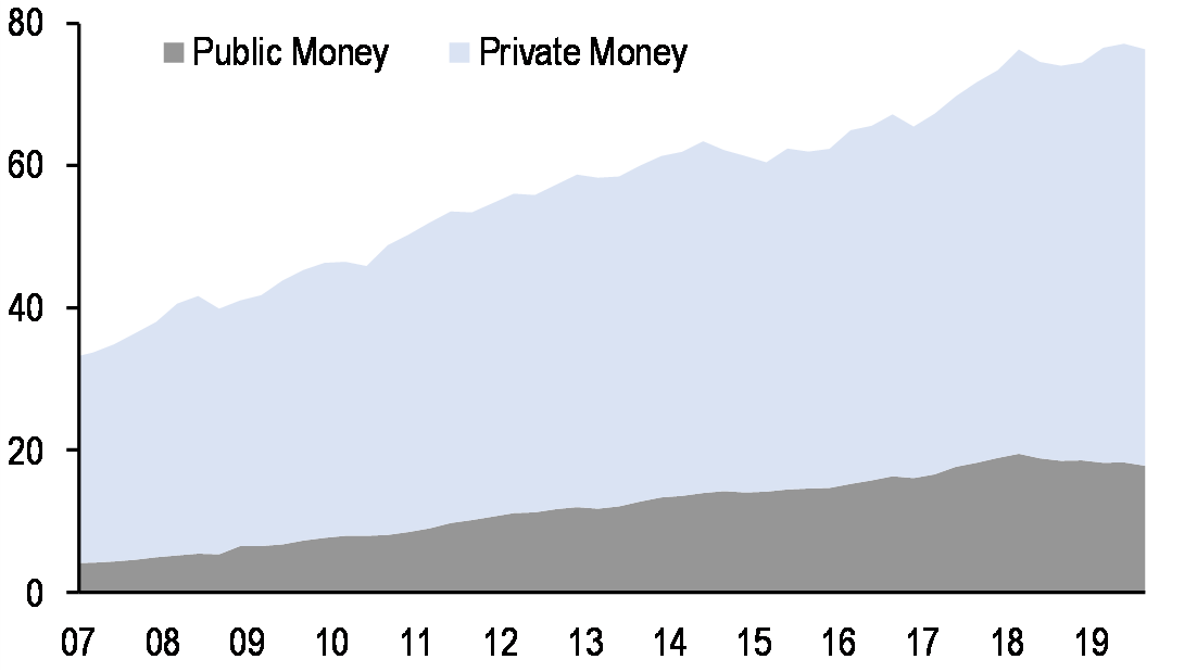 As emerging technologies continue to disrupt every industry and as consumer preferences evolve, modernization of payments is now a global theme. 2019 will be remembered for the rise of digital money. The groundwork is now in place for more mainstream adoption of blockchain technology at the same time that the foundation is being established for the development of digital currency and fast payments. Although legal and regulatory frameworks and technical challenges remain high, the past year was marked by a number of breakthroughs, notably widespread blockchain technology adoption by stock exchanges, the explosive growth of third-party payment systems in China, which suggests that the transition to a mostly cashless economy can be managed at scale, and the launch of options on bitcoin futures contracts on regulated exchanges. The technology challenges for bitcoin opened up the opportunity for alternative cryptocurrencies to fuel blockchain adoption. That led to a surge in alternative cryptocurrencies, many with questionable initial coin offerings (ICO). USD Coin recently launched in 85 countries. JPMC became the first national bank to create and successfully test with clients a digital coin representing fiat currency with the announcement of the JPM Coin project, which is a digital coin representing US dollars held on deposit at JPMCB, designed to facilitate payments between institutional JPM clients.3 China is developing its own central bank digital currency, a digital yuan or “e-yuan,”4 and other central bankers have started to seriously examine a supranational multi-currency-backed token as a replacement global reserve asset. But the failed release of Facebook’s Libra serves as a reminder that rapid adoption faces practical challenges to attain scale. For a stablecoin like Libra to succeed, it will likely require short-term liquidity facilities, a source of positive-yielding collateral (for those coins relying on reserve asset income), and less distributed, semi-private networks.