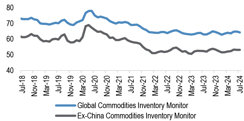 Commodity inventories are inherently seasonal in nature. On a seasonal basis, July monthly inventory availability at the world level typically declines by the most all year (5-year average decline of -1.8% MOM), while the Ex-China CIM typically declines by some -0.6% MOM. The July 2024 GCIM declined at a much slower pace of -0.9% MOM, similarly the Ex-China CIM stability was also contrary to the seasonal norm ( Figure 7, Figure 8).