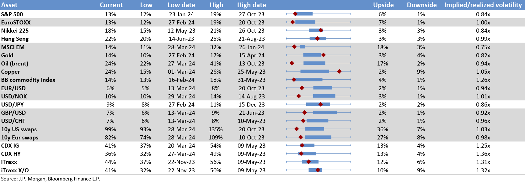 This table shows the richness/cheapness of current three-month implied volatility levels (red dot) against their one-year historical range (thin blue bar) and the ratio to current realised volatility. Assets with implied volatility outside their 25th/75th percentile range (thick blue bar) are highlighted. The implied-to-realised volatility ratio uses 3-month implied volatilities and 1-month (around 21 trading days) realised volatilities for each asset.