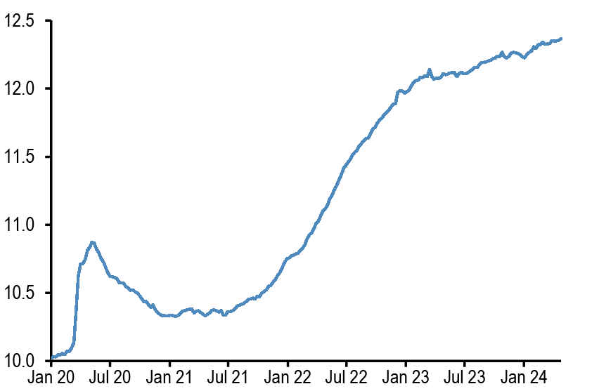 • After the release this week of the Fed’s senior loan officer survey, along with the ECB’s bank lending survey that was released a few weeks ago, financial conditions have again featured in our conversations. After the significant decline in respondents reporting a tightening in lending standards in both the US and the Euro area in the 1Q24 surveys, the latest survey suggested a modest tightening for the US in 2Q and a continued modest decline to close to zero for the euro area.
