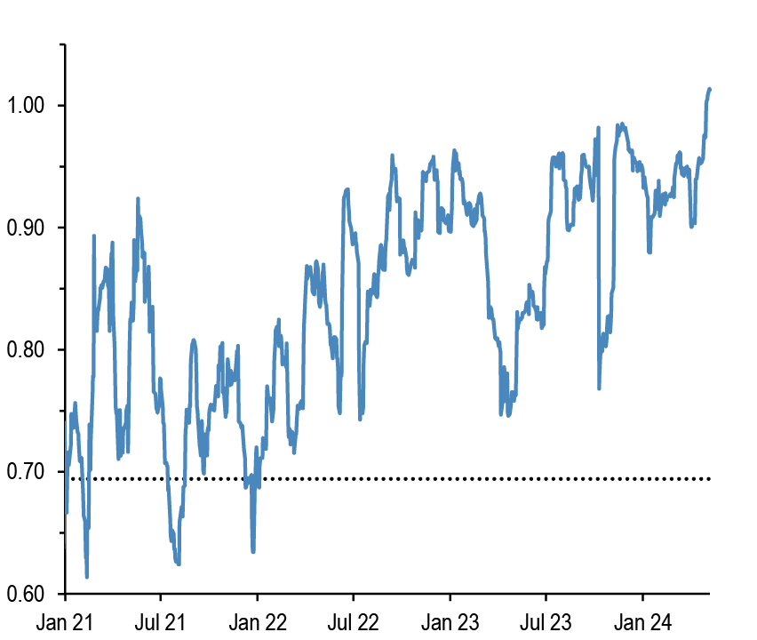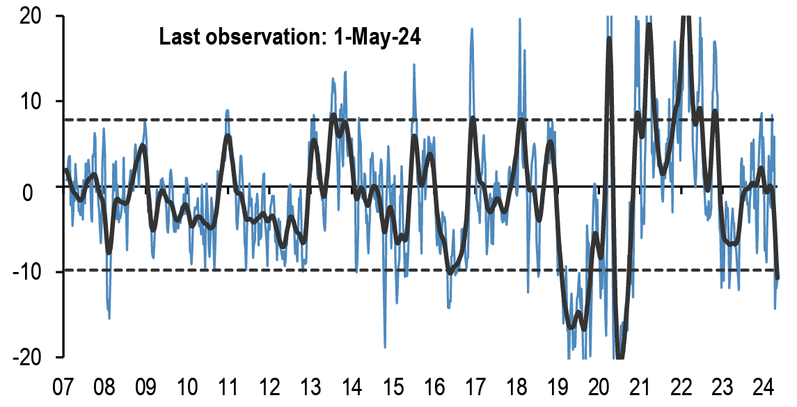 • After the release this week of the Fed’s senior loan officer survey, along with the ECB’s bank lending survey that was released a few weeks ago, financial conditions have again featured in our conversations. After the significant decline in respondents reporting a tightening in lending standards in both the US and the Euro area in the 1Q24 surveys, the latest survey suggested a modest tightening for the US in 2Q and a continued modest decline to close to zero for the euro area.