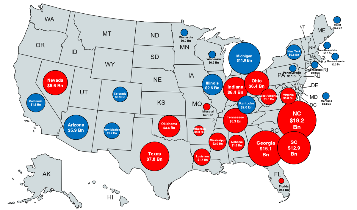 $ in billions, bubble color = party of Governor (Red = Republican, Blue = Democrat)