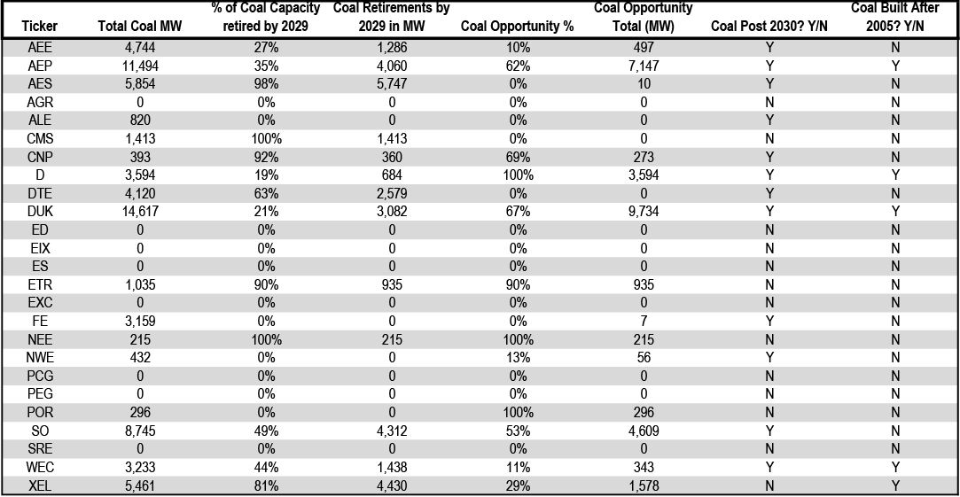 Race to exit coal will continue, regardless of EPA rules or the next President. While the federal court’s composition could possibly somewhat shield utilities with high coal exposure from the Biden Administration’s proposed EPA regulations, we still see significant C&I decarbonization pledges, ESG considerations regarding coal, and advantaged renewable economics motivating utilities to create credible generation transition plans that exit coal. As discussed in our eighth Green Ranker, coal retirements typically translate into higher renewable generation capex, and we find coal exits as a compelling mechanism for IOUs to garner favorable market attention and lower customer bills. Despite many utilities’ plans to exit coal by 2030, we note that higher-than-expected power demand growth, including from data centers, could push back some coal plant retirement timelines. We highlight utilities with high coal exposure beyond 2030 (AEP, D, DUK, and SO) as carrying the highest exposure to current and future EPA regulations. Larger picture, given continued pressure from investors, local and state governments, and market forces, we expect coal retirements to present opportunities, even during a second Trump Presidency.