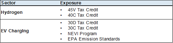 • Clean Energy stocks broadly have been under pressure, largely on fundamental factors vs. political risk, with limited IRA benefits baked into valuations: Within our Clean Energy coverage, we include direct IRA benefits in our price target methodology for five product companies (FSLR, ENPH, SEDG, ARRY, and NXT). Three of the five stocks currently trade below the portion of our YE24 valuation based solely on organic operations, excluding value given to direct tax credit benefits. Sentiment around stocks in sub-sectors such as EV charging and green hydrogen has already been challenged due to weak fundamentals, with the stocks lagging the broader market by 17% YTD and 42% YoY, and, as such, we see risk for further downside on negative headline risk associated with the election outcome.