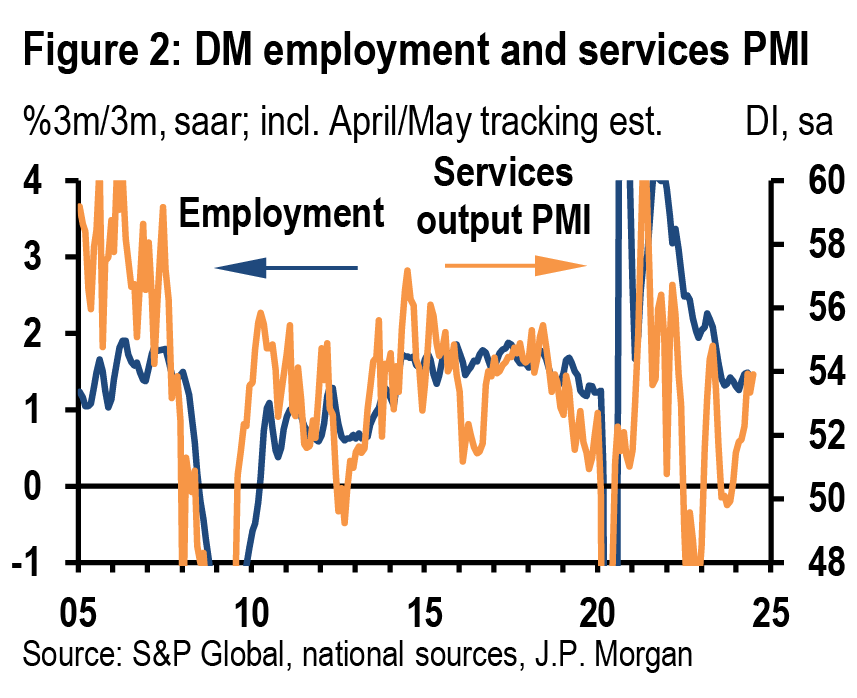 manufacturing recovery. We see two reasons to be cautious in interpreting the manufacturing PMI. First, the survey has consistently underestimated output gains in recent years, delivering sporadic downbeat signals that were reversed. Second, we see fundamental supports for both consumer and business spending and both are tracking solid gains around midyear. More broadly, this month’s manufacturing survey contrasts with an upside surprise in services. The all-industry survey remained stable in July as the services survey moved higher in both the US and Japan (Figure 2). Combined with solid labor market indicators this points to sustained service sector and GDP growth.