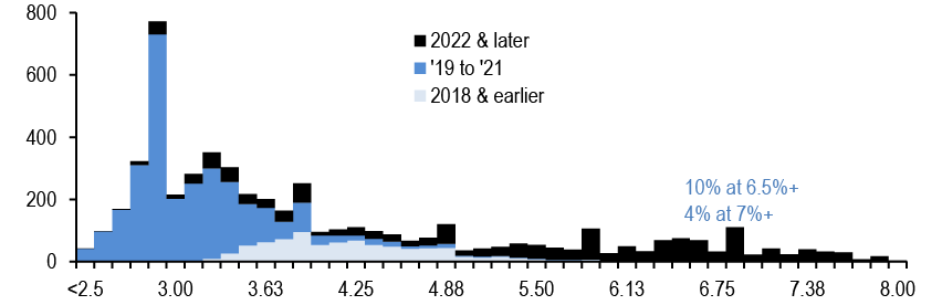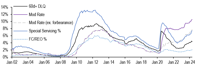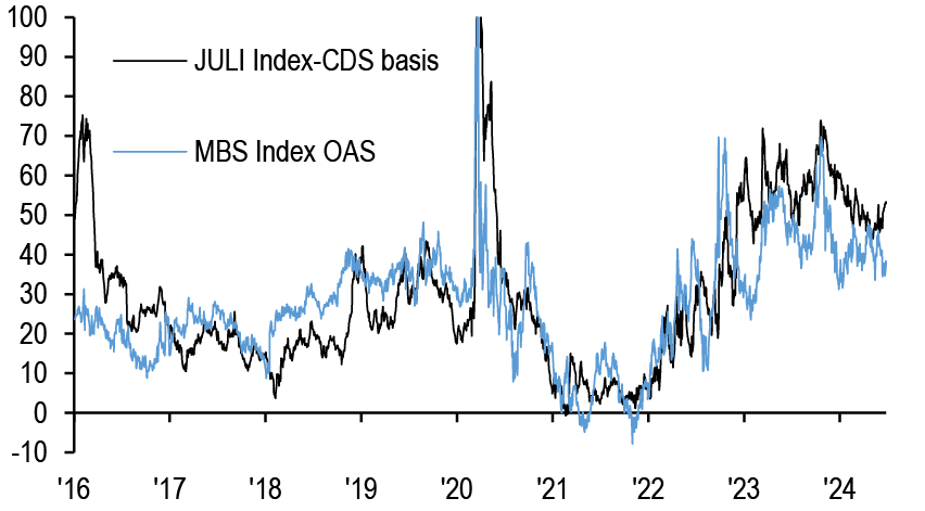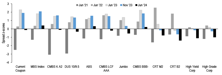 Mortgages are a bit snug, but not terribly so. If our house rate forecast of a single cut this year is realized, higher coupons should again outperform in the second half of the year. CRE transaction cap rate expansion has been muted year-to-date through May. CMBS is no longer a ‘cheap’ asset class and spreads across the stack appear full.