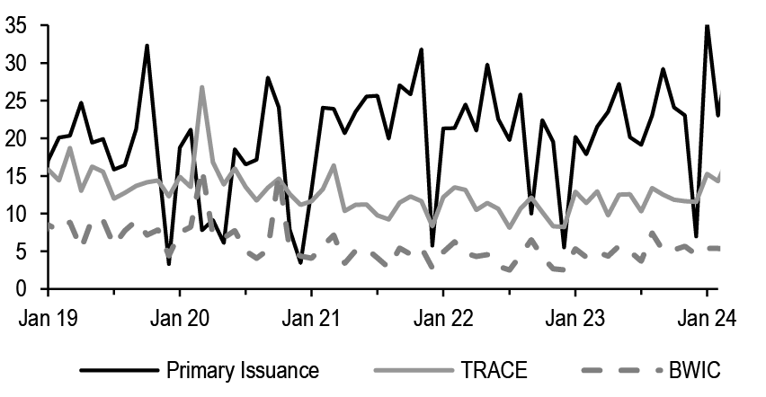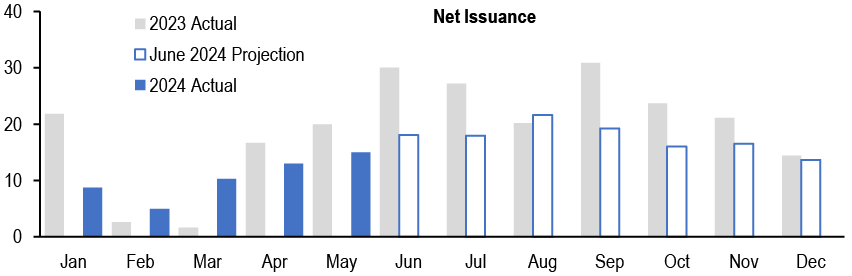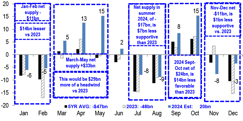 - We revise up our 2024 long-term net issuance forecast across US fixed income markets by $225bn to $3.275tn given heavy corporate credit supply in 1H24. We do not expect further Treasury coupon auction size increases until November 2025