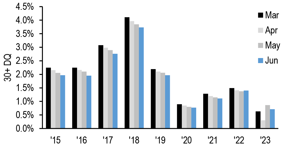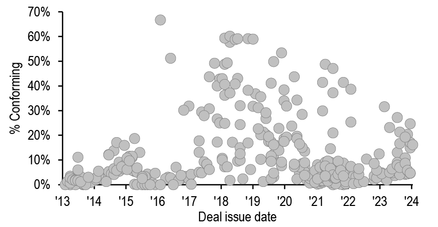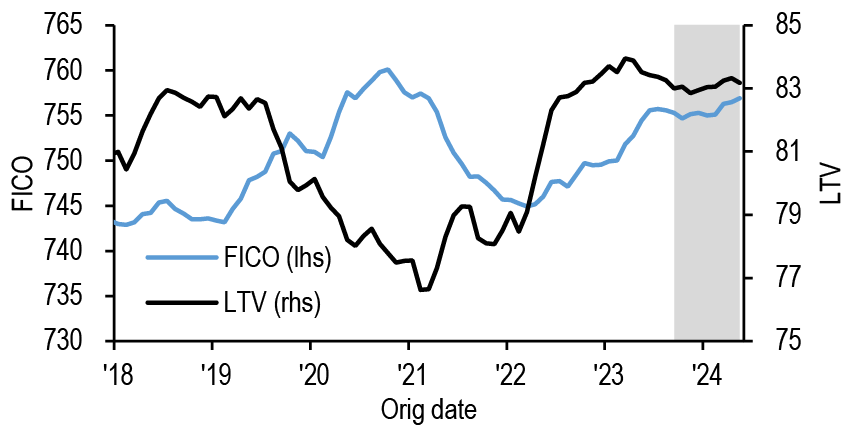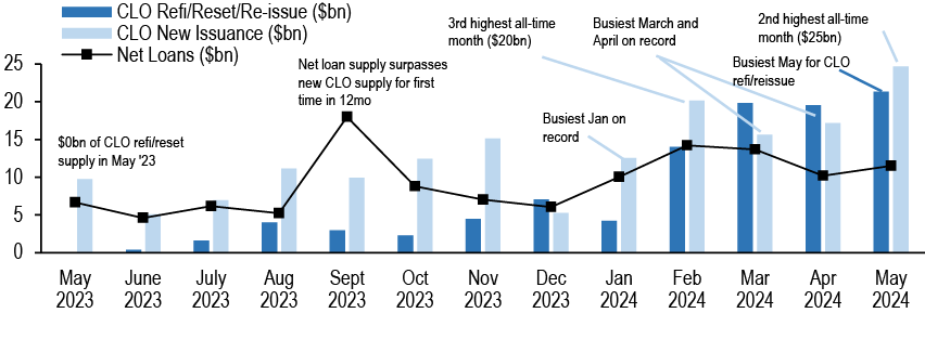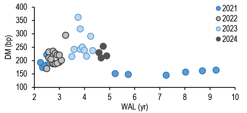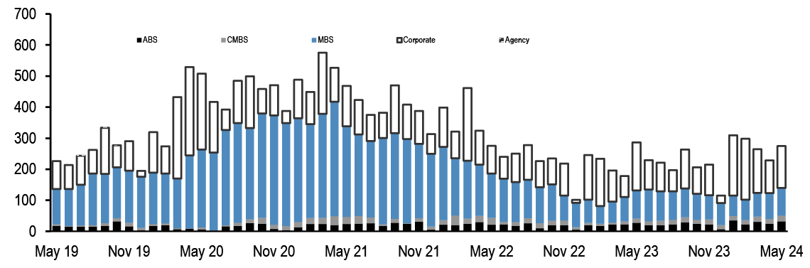 We expect that ABS should continue to outperform over 2H24, with tighter spreads despite brisk issuance, and structures holding up well against minimal credit deterioration. Demand for floaters is solid and CLO T1 AAAs swept through our 140bp MY target and are closer to our 130bp YE target we set back in April.
