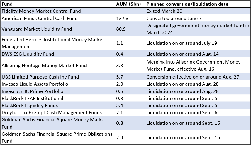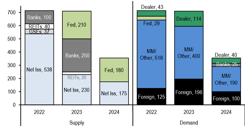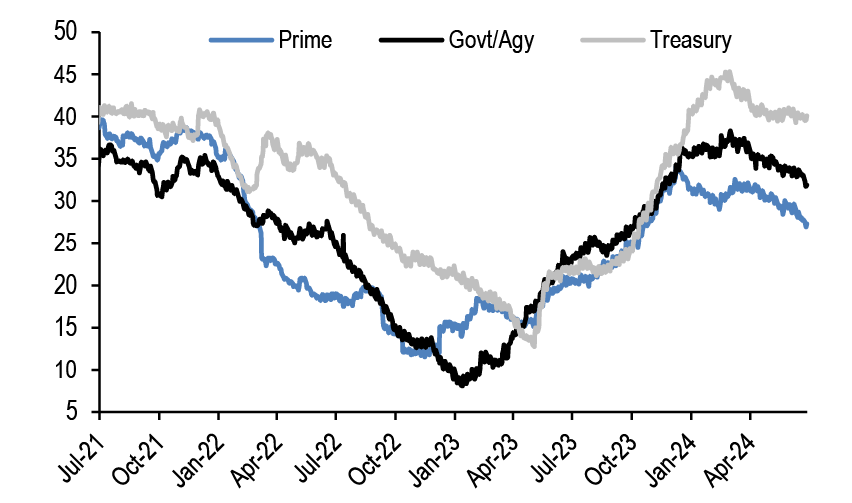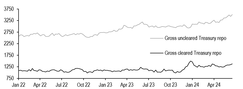 Funding conditions should remain benign, with liquidity remaining abundant, limiting any potential impacts to spreads. MMF reform should not have any outsized impact on money market credit spreads. Treasury repo clearing is work in progress, but concerns about readiness are emerging. Total money market supply (ex-Fed) should increase by nearly $550bn in 2H24, driven largely by T-bills and dealer repo.