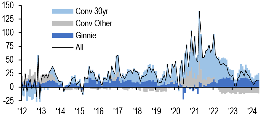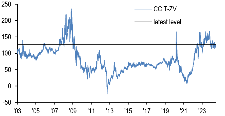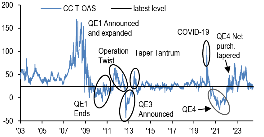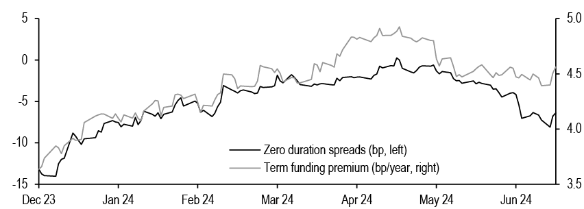 - Derivatives: Option-implied Fed expectations have coalesced around a moderate cutting path, which implies lesser jump risk and favors carry trades on the curve as well as short-gamma strategies. Term funding is expected to drift higher in coming months. We look for wider swap spreads in the front end, but long-end spreads are likely to remain flat to current levels