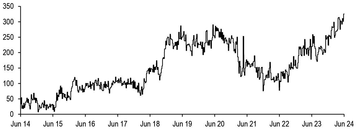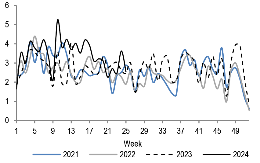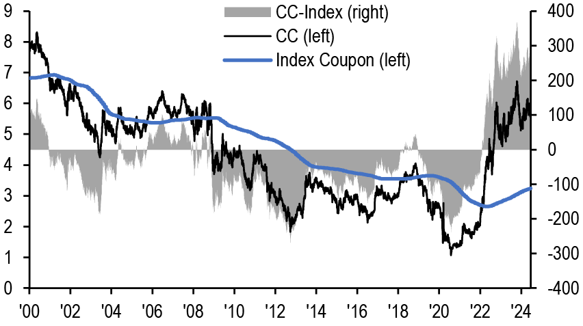 Economics & Rates: Consumer spending growth has moderated recently, as the post-pandemic tailwinds supporting last year’s exceptional growth have begun to normalize. While there are mixed signals from the labor market, the broad thrust of the data indicates that nominal labor income growth should continue coming back down to earth in 2H24, providing a further tempering influence on consumers. Business capital spending has been supported by IRA and CHIPS Act-related spending. The more recent data suggest that the growth in this policy-supported capex is starting to peter out. Outside of this category, business capital spending growth has been soft, and business surveys indicate that this should remain the case in coming months. Though the inflation process has been bumpy over 1H24, we look for core inflation to cool gradually on a sequential basis over the second half, though base effects should drive core PCE slightly higher again later in the year. We forecast core PCE inflation to run at 2.8% q4/q4 in 2024 ( Figure 2). Against this backdrop, we expect the Fed will cut rates at the November FOMC meeting and continue at a quarterly cadence in 2025. While a September cut remains a risk, we think it may take the five reports available between now and the November FOMC meeting to see a broader weakening in job growth (see Economics).