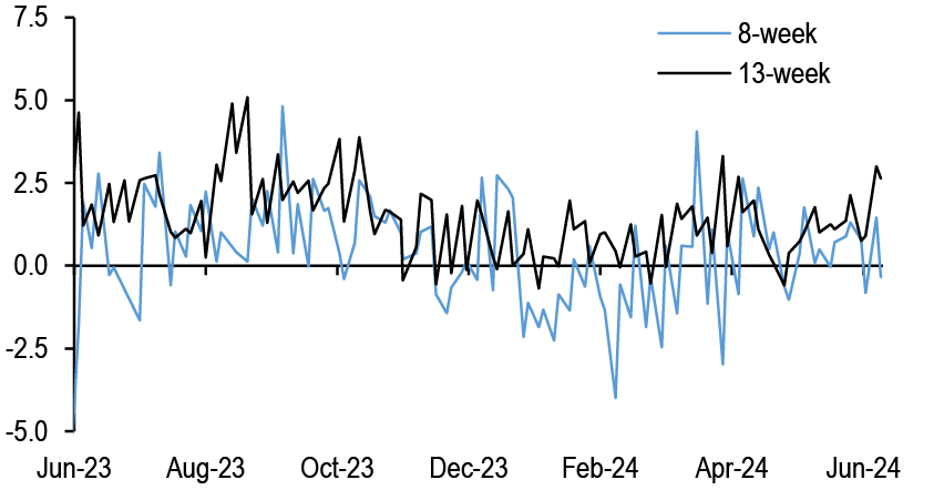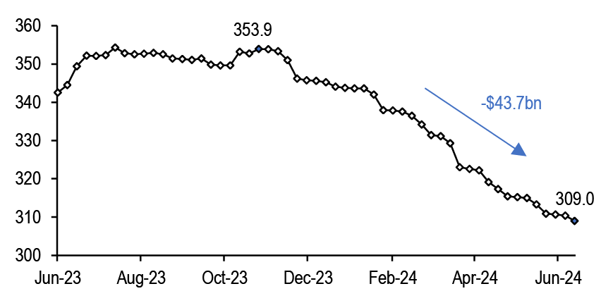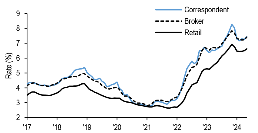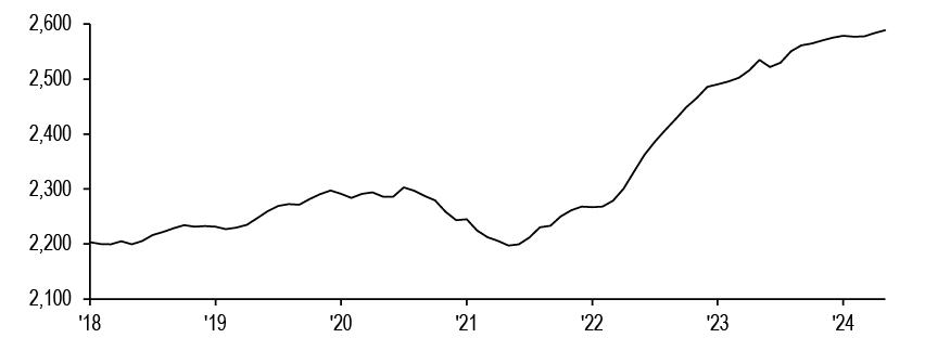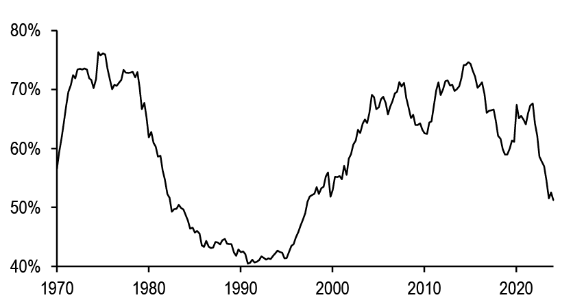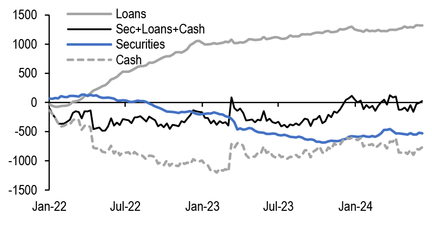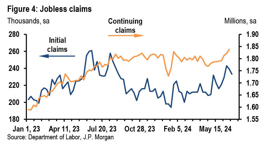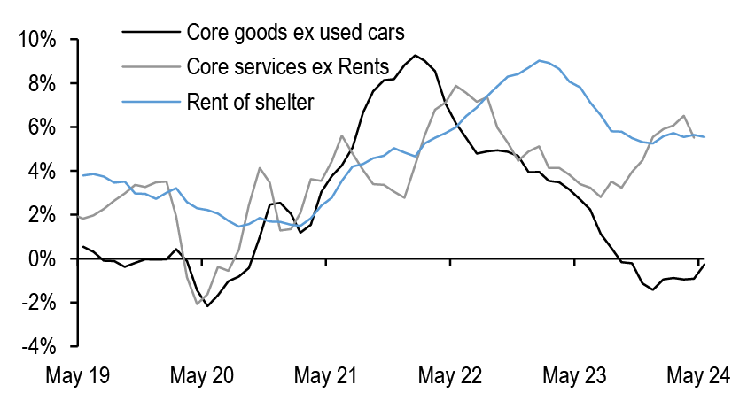 - We expect core PCE inflation to soften sequentially and GDP growth to step down to 1% saar in 2H24. We see the first Fed rate cut in November, followed by a quarterly cadence thereafter. We think balance sheet runoff can continue at the now-tapered pace over the remainder of the year