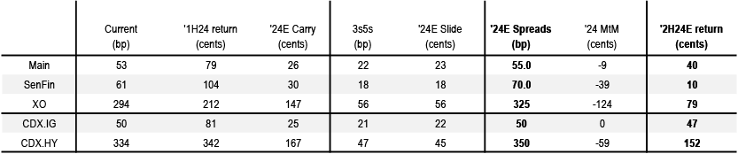 | JULI spread to Treasuries (bp) | 109 | 110 | Less demand and less supply in 2H24 vs 1H24 argues for spreads slightly less tight than previously expected.Slower growth and election volatility are risks, duration demand post a Fed cut could drive tighter spreads. |