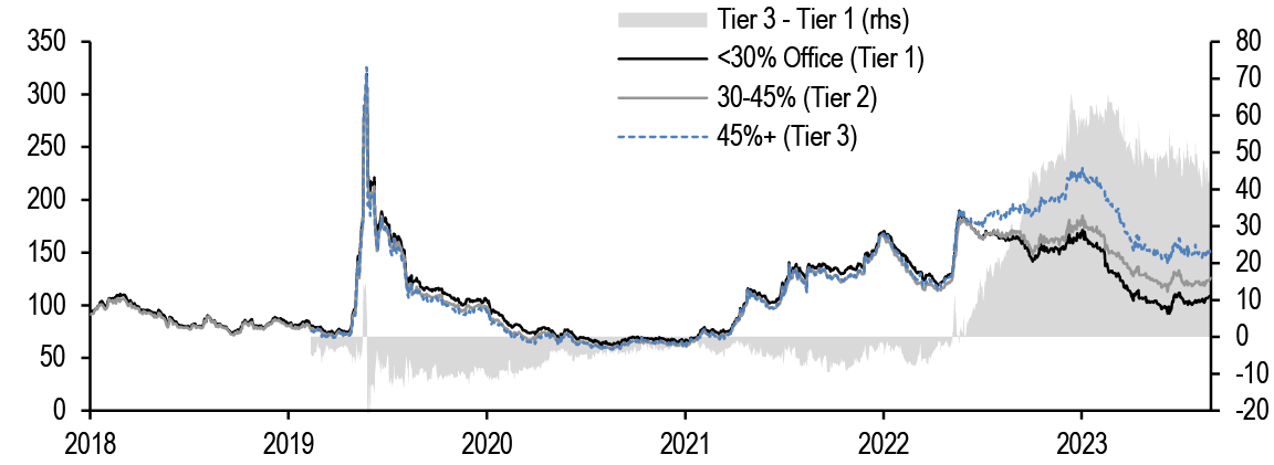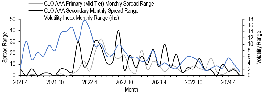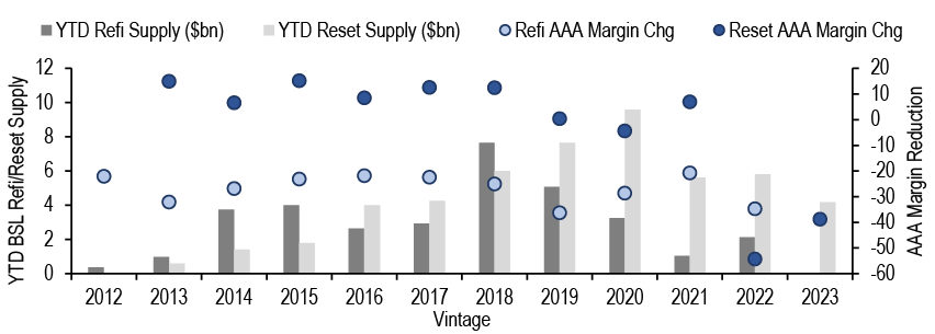 | US CLO Primary AAA (Tier 1, bp) | 138 | SOFR + 130 | CLO new issue T1 AAAs recently reached our MY spread forecast of 140bp in the US. Our 130bp YE target may well be met sooner on strong technicals and bid for floating rates. |