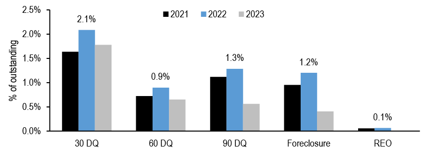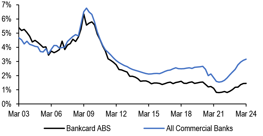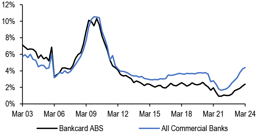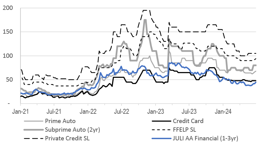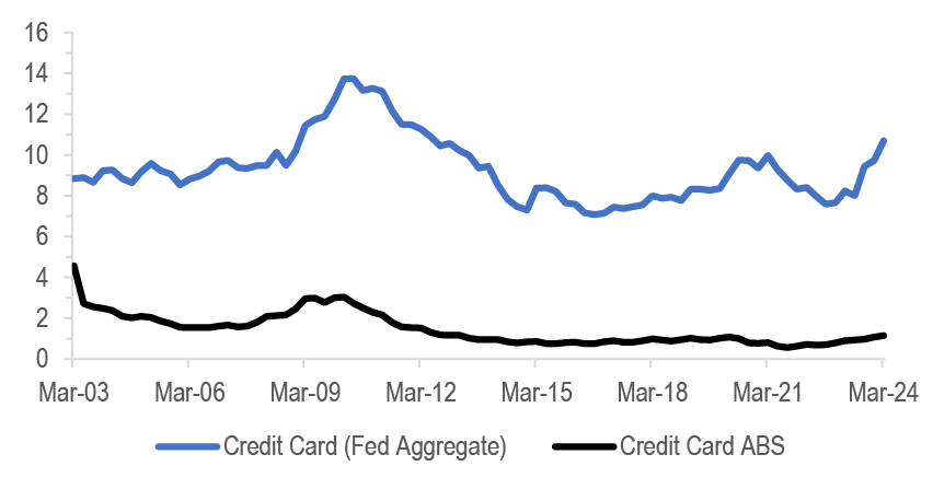 | 3-year AAA card ABS to Treasuries (bp) | 48 | 40 | Despite the recent spread rally, ABS remains relatively cheap to corporates; however, it is tough to make a case for material spread tightening from hereon given the macro uncertainty still ahead in 2024 |